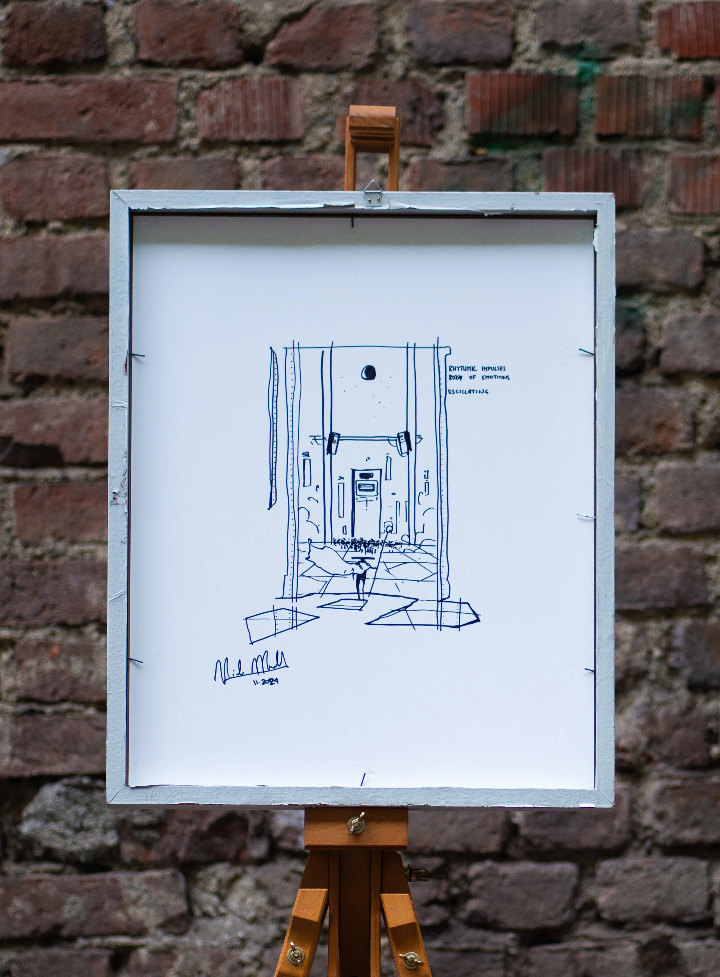 The artworks reflects on the power of rhythm to shape and mirror human emotions. The "body of emotions" suggests a group physical response to sound, while "oscillating" hints at the rhytm feeling. The artwork and poem together capture the visceral, hypnotic pull of music as it resonates through the body and psyche.